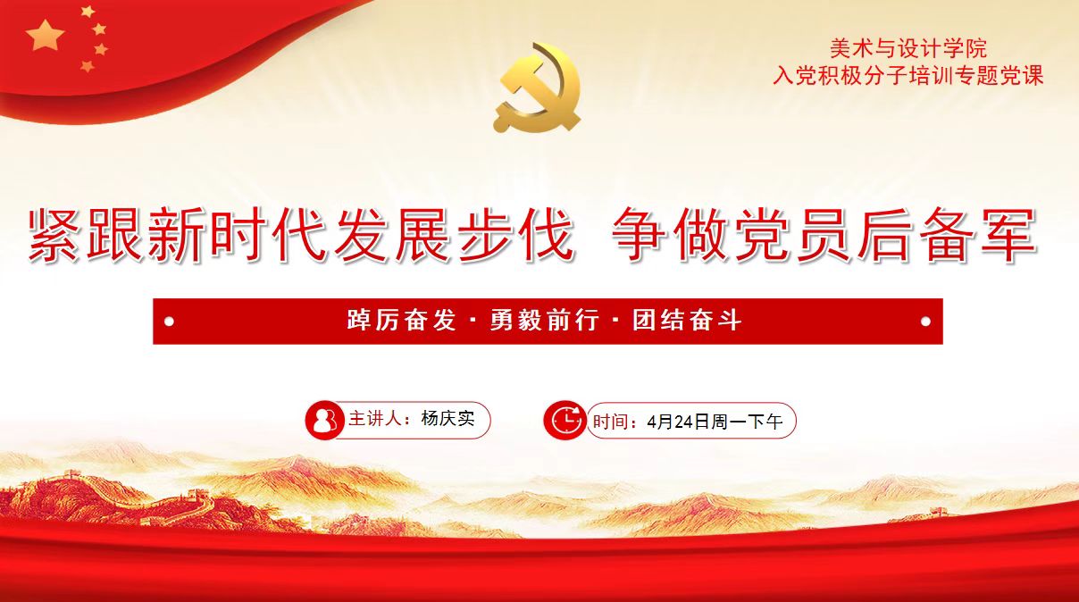 4月24日下午,美术与设计学院党委书记杨庆实在西校区七号楼一楼多功能厅以“紧跟新时代步伐,争做党员后备军”为题上专题党课,学院新确定的77名学生入党积极分子认真学习聆听专题党课。