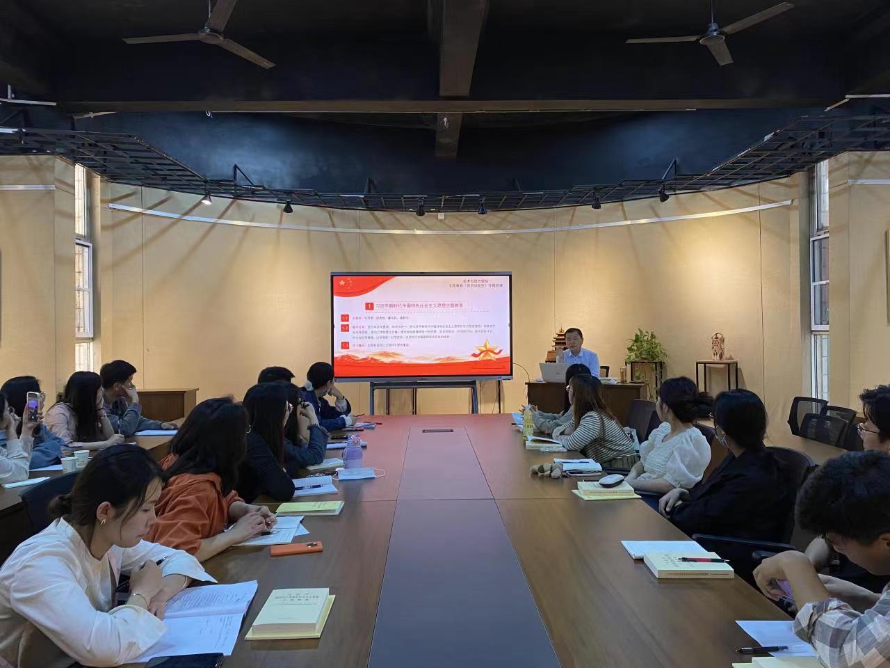 5月11日下午,美术与设计学院党委书记杨庆实在西校区七号楼一楼多功能厅,以“学深悟透新思想 砥砺奋进新征程”为题,为毕业生党员上主题教育专题党课。学院毕业生党员二十余人到场认真学习。