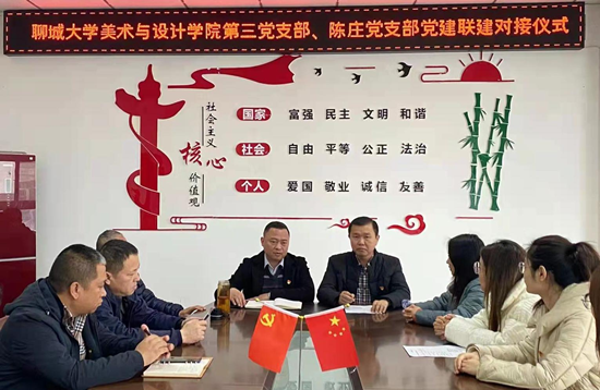 为继续推进党史学习教育“我为群众办实事”志愿实践活动,为校地基层党组织及党员之间搭建相互学习、相互提高平台,12月10日上午,聊城大学美术与设计学院学生第三党支部赴聊城市东昌府区柳园街道文苑社区,与陈庄股份经济合作社党支部开展党建联建对接活动。柳园街道文苑社区陈庄股份经济合作社支部书记李庆磊、支部委员陈雷、李洪生、李峰、陈海勋,以及美术与设计学院党总支副书记杨庆实、组织员许中美、学生第三党支部书记朱晴、支部委员王欣然、第三党支部学生党员十余人参加对接仪式。对接仪式在陈庄党建会议室进行。