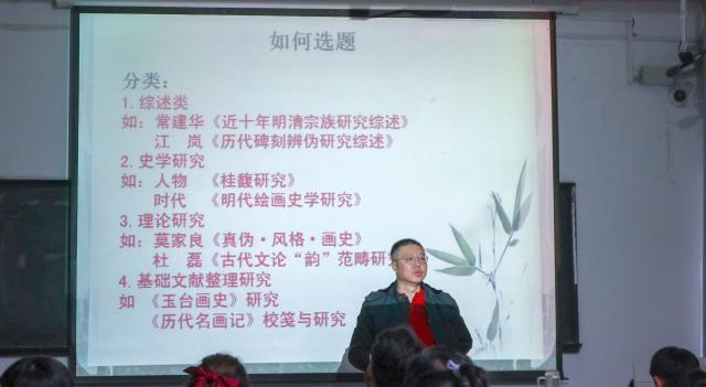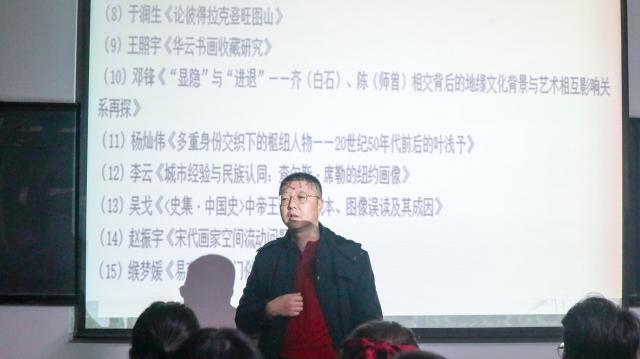 张函主要从选题、摘要、引言、标题、注释、结语、参考文献七个部分讲解了如何撰写学位论文。首先他以第二届青年美术论坛入会资格论文题目为例着重阐述了如何选题,并强调了题目的选择至关重要,不仅要找准突破口,还要结合自己的实际能力,充分考虑开展研究的主客观条件。其次从论文摘要、引言、标题、注释、结语等方面讲解了论文主要内容的撰写。论文摘要包括整体概括论文的写作内容、简单介绍每一章的内容以及关键词;引言包括选题意义、学术史动态说明、研究方法;标题论文的正文常用范式;注释的脚注和尾注显示位置不同作用就不同;结语是对课题的结束性说明,其中包括一些关于课题的研究内容,而不在本次研究范围之内的问题需做简单说明以及对课题的可持续研究说明。最后强调了参考文献的重要作用。参考文献是文章或著作等写作过程中参考过的文献,是在学术研究过程中对某一著作或论文的整体的参考或借鉴。
