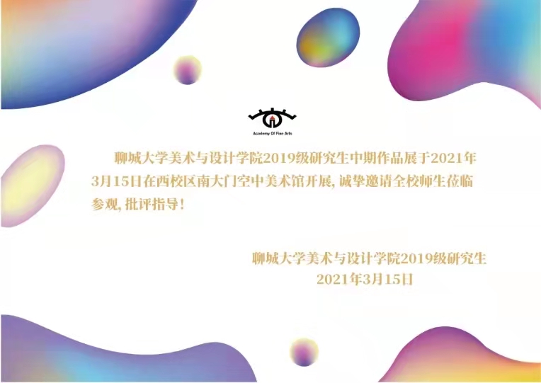 聊城大学美术与设计学院于2021年3月15日举办了2019级艺术硕士研究生中期作品展,此次展览在聊城大学空中美术馆展出。作品包括美术(书法、国画、油画)、艺术设计(视觉传达设计、环境艺术设计)两个领域,作品共计一百一十余幅。
