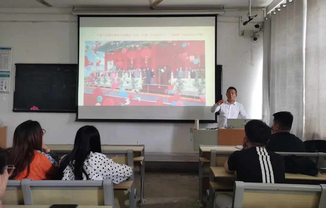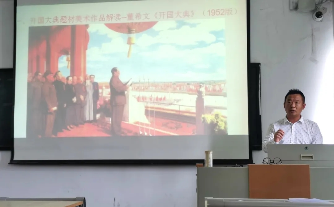 王老师通过精心准备的课件,主要从四个方面分享了历史题材美术创作的相关知识,一是开国大典题材美术作品解读,通过对董希文的油画作品《开国大典》(1952年、1954年、文革时期、文革后临摹版本),唐勇力的国画作品《新中国的诞生》(2009年、2015年),赵力中的油画作品《日出东方·1949》(2007年),马泉的年画作品《中国人民站起来了》(1983年),赵建成的国画作品《换了人间—1949 北京》(2017年),这几幅都是开国大典题材的巨幅力作,从不同角度展现了开国大典最具神圣庄严的时刻,从创作构思(构图)、人物造型、技法表现、艺术共鸣等方面分析,解读了这几幅作品的艺术特色、艺术价值和艺术内涵。二是历史题材美术作品的创作原则,通过开国大典题材美术作品的欣赏与讲解,总结出历史题材美术作品的创作原则应该是还原现场,尊重事实,用一种使命感的心情加之艺术表现的方式方法,挖掘历史题材的精神内涵,再现画面中的人物精神世界,在构思立意中,反复推敲画面中人物的神与势,运用各种手段和方法达到观者和画面中人物的精神交流。三是历史题材美术作品的创作方法,即收集资料,身临其境(收集图片资料,可以通过图书馆、档案馆、网络等途径;通过实地考察——登临天安门城楼,感受实地,感染气息;反复观看影视资料,收听音像资料,揣摩人物动态和心态,激发灵感。),草图推敲,运筹帷幄。四是又通过分析其他历史题材美术作品,如:詹建俊的油画作品《狼牙山五壮士》(1959年),靳之林的油画作品《南泥湾》(1964年),韩硕的国画作品《热血》(1999年),杨立舟、王迎春的国画作品《太行铁壁》(1984年)等,引发的创作启示,即天人合一,师法自然;独辟蹊径,锐意进取;根植传统,文化自信;等等。
