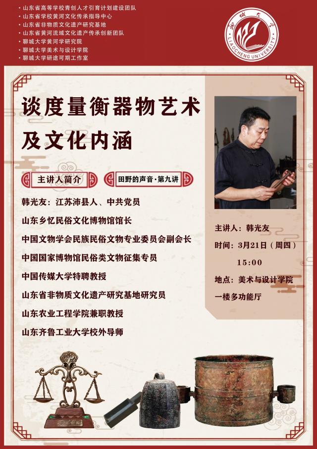 3月21日,山东乡忆民俗文化博物馆馆长、中国文物学会民族民俗文物专业委员会副会长韩光友应邀为我院作题为《谈度量衡器物艺术及文化内涵》的讲座。此次讲座由王青嵩副院长主持,60余名师生参加了讲座。