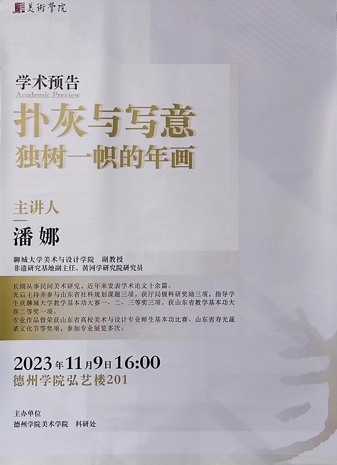 我院潘娜副教授应邀为德州学院作学术讲座 作者:孙艺 来源:美术与设计学院 发布时间:2023-11-10 阅读次数: 11月9日,我院潘娜副教授应邀为德州学院美术学院师生作“扑灰与写意:独树一帜的年画”为题的学术讲座。潘老师从扑灰年画的起源与流变、扑灰年画的工艺流程、扑灰年画的当代价值三个方面进行了详细阐述,让在座的师生对扑灰年画有了较为深入的了解。此外,潘娜老师还就非物质文化遗产保护的若干问题与德州学院师生进行了交流。 审核 张兆林 王蕊 袁晨悦 焦金铎 魏琳琳