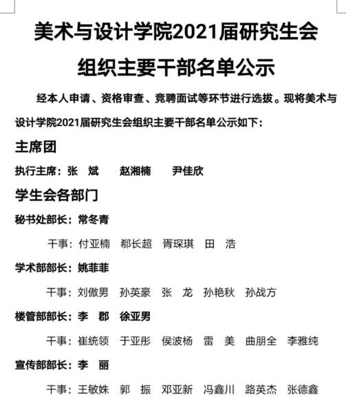 2020年9月28日下午,美术与设计学院二零二一届研究生会竞选大会在7号教学楼401教室举行,参加本次大会的有美术与设计学院团委书记相萌萌及美术与设计学院二零二零届研究生会主席团及各部部长,参加此次竞选的有三十余人。