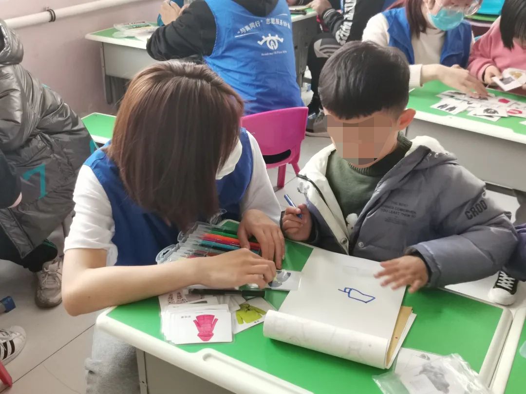 此次活动旨在通过陪伴孩子,给予自闭症儿童一个包容、关爱的社会环境。志愿者用准备好的彩笔、图画本以及颜色相应的衣物图片,手把手教孩子们认识颜色,辅助孩子们选择与卡片相同颜色的彩笔进行绘画,志愿者们教孩子们认识所选的颜色,并换不同的颜色进行练习。 绘画能给人们呈现出一种最为切实的视觉形象,通过绘画,可以探索情感。当“星儿”们在作画的时候,我们要做的便是倾听,倾听他们通过作品所释放出来的情感讯息。随后,志愿者们教孩子们如何区分四季不同的衣物,增添生活常识。有的孩子们根据志愿者的衣服进行绘画,将自己的想象力全部展现在作品里,充分表达了孩子们丰富的内心世界。绘画过程中,志愿者给予孩子们鼓励与赞美,提高孩子们的成就感与自信心。