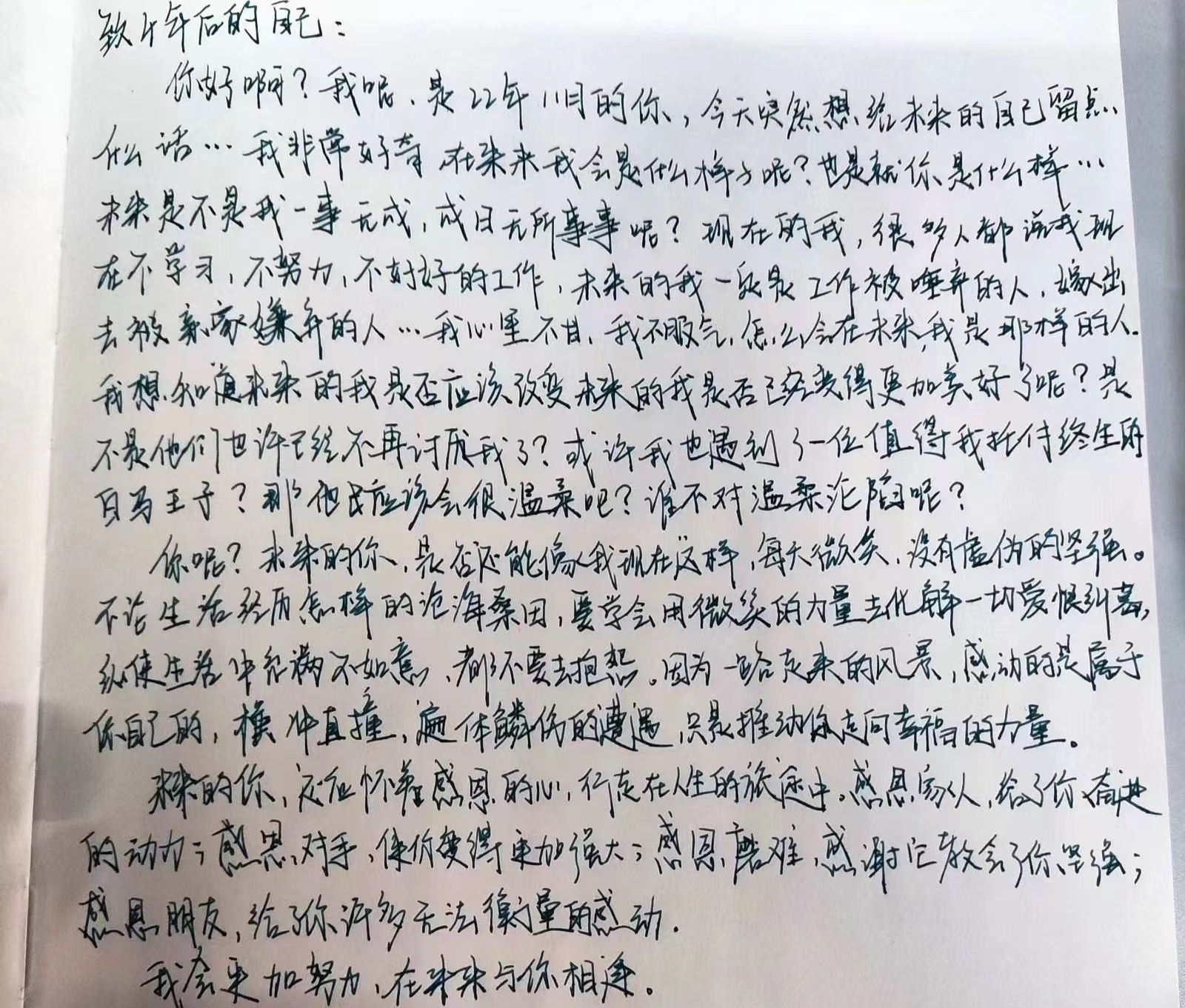 我国的书信历史源远流长,本次征文也主要通过书信的形式,引导同学们跨越时空与未来的自己对话,写下自己对未来的规划以及憧憬,帮助同学们增加对未来学习生活的思考。在征收的书信作品中,同学们将压抑在心中未曾说出的想法、对未来的期许及心中所念写于纸上,通过漂流邮寄给未来自己。许多同学在心中认真进行了自我评估,畅想了未来职业的发展方向及目标,也制定了科学的实施计划和措施。唤起了对校园生活的热爱与珍惜、对未来的憧憬和畅想,促使同学们把握当下,激发了勇闯未来的动力。活动过程中,组织者指导督促同学们按时提交作品,并及时疏导解决同学们的各种问题,帮助同学们了解活动流程以及注意事项。工作人员对参赛的作品进行了整理以及评比,对参加活动的同学们给予鼓励。