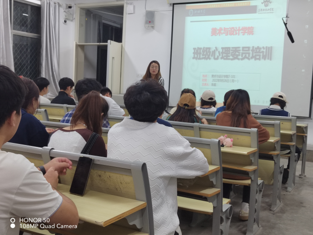 为充分发挥班级心理委员在学校心理健康教育工作中的重要作用,有效推进学校心理健康教育工作的开展,搭建班级心理防护体系,更好地为全校心理健康教育保驾护航,9月25日19:30美术与设计学院朱晴老师组织各班心理委员于西校区7#201召开了“阳光心理 温暖心灵”的心理培训。