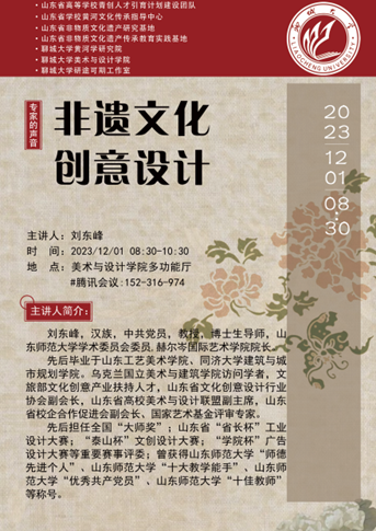 2023年12月1日上午,聊城大学美术与设计学院邀请山东师范大学学术委员会委员、赫尔岑国际艺术学院院长、博士生导师刘东峰教授,在学院一楼多功能厅作线上《非遗文化创意设计》学术报告。报告由非遗工坊研修班班主任刘昆副教授主持,研修班全体学员和学院部分师生40余人参加了报告会。