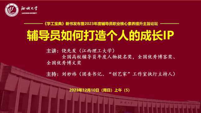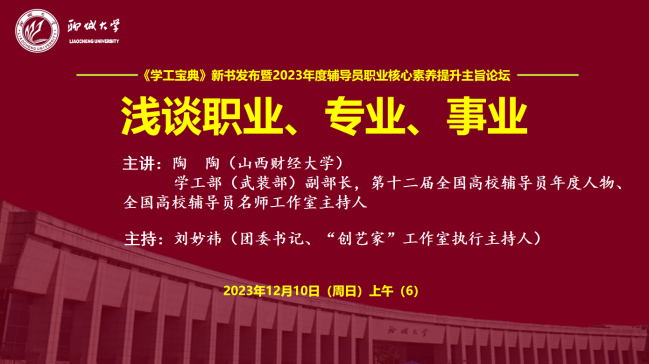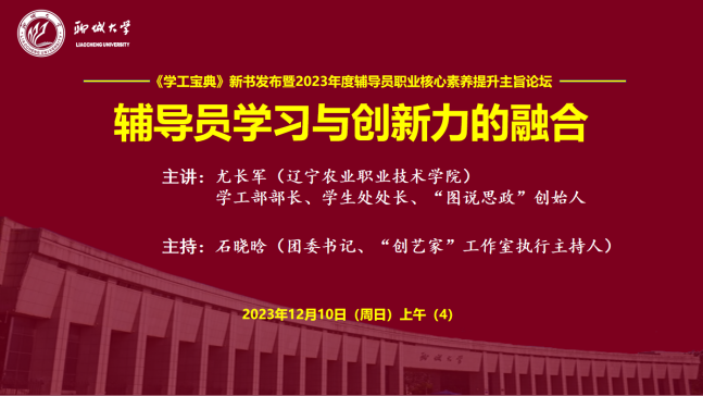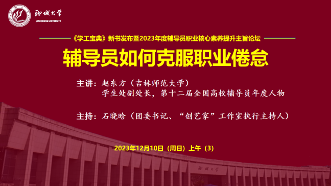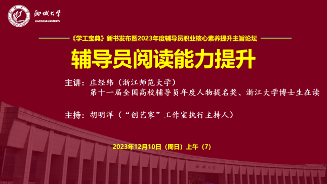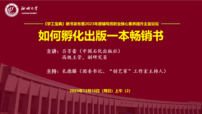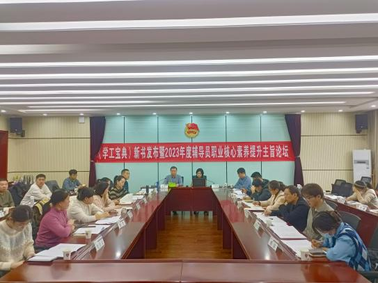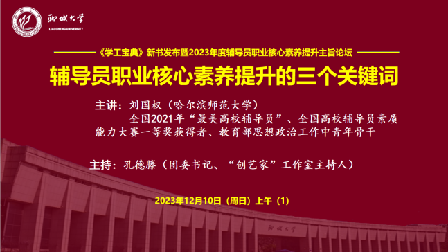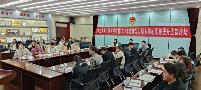 为学习贯彻习近平新时代中国特色社会主义思想和党的二十大精神,落实立德树人根本任务,提升高校思想政治教育工作队伍建设和科学水平,12月10日,由山东高校辅导员名师工作室(聊城大学)、中国石化出版社指导,聊城大学“创艺家”辅导员成长工作室、山东高校辅导员名师工作室“明法”工作室(聊城大学)、东昌学院“莉志成才”工作室、聊城大学家校共育辅导员工作室、山东第一医科大学山河心魂辅导员工作室、山东高校辅导员名师工作室红润初心工作室(青岛科技大学)、聊城大学“研途可期”工作室、聊城大学“向阳花”大学生心理健康教育与指导工作室、聊城大学大学生社区党建工作室联合主办的“《学工宝典》新书发布暨2023年度辅导员职业核心素养提升主旨论坛”在聊城大学顺利举行。论坛采用线上线下方式进行,线下近40人、线上近1万人次思想政治教育工作同仁参加论坛并展开交流研讨。