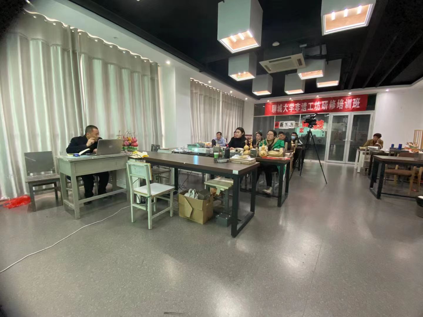 12月13日下午,东昌铜铸雕刻技艺省级非遗传承人马先明老师来到聊城大学空中美术馆,给聊城大学非遗工坊带头人研培班开展讲座。