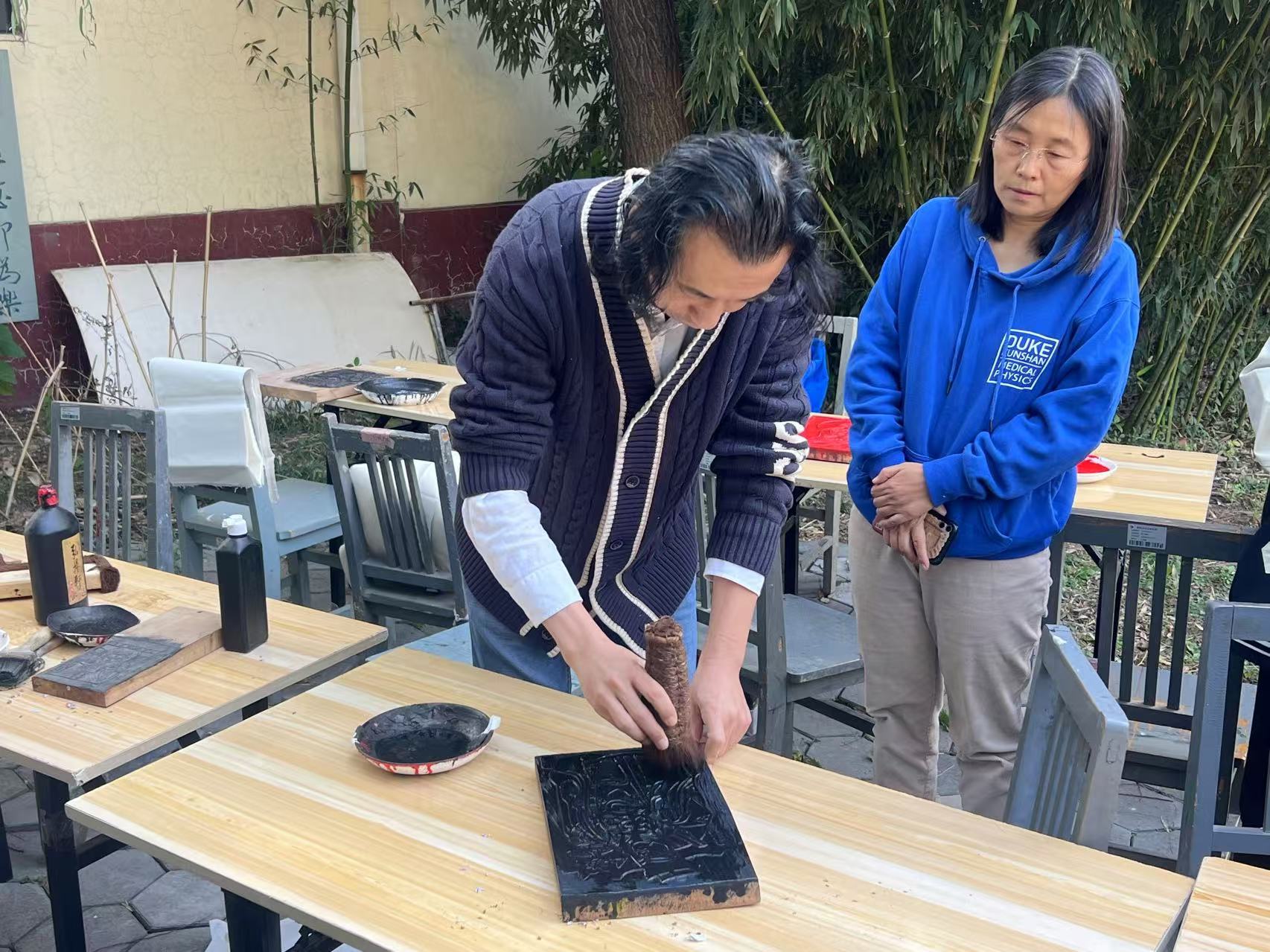 接着,刘老师又详细展示了如何印制木版年画。他指导学员们如何运用鬃刷均匀涂抹墨汁于雕版上,并强调在印制过程中需两人协作,将宣纸精准地覆盖于年画之上,随后迅速而轻柔地运用趟子按压宣纸,从而成功印制出精美的东昌府木版年画。