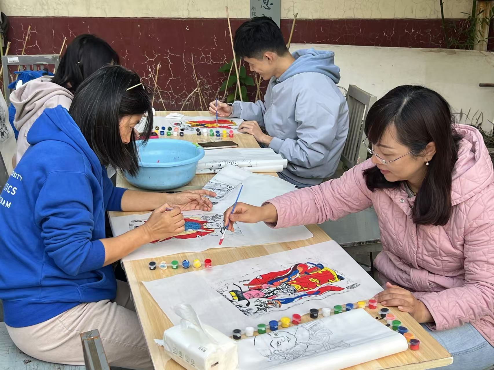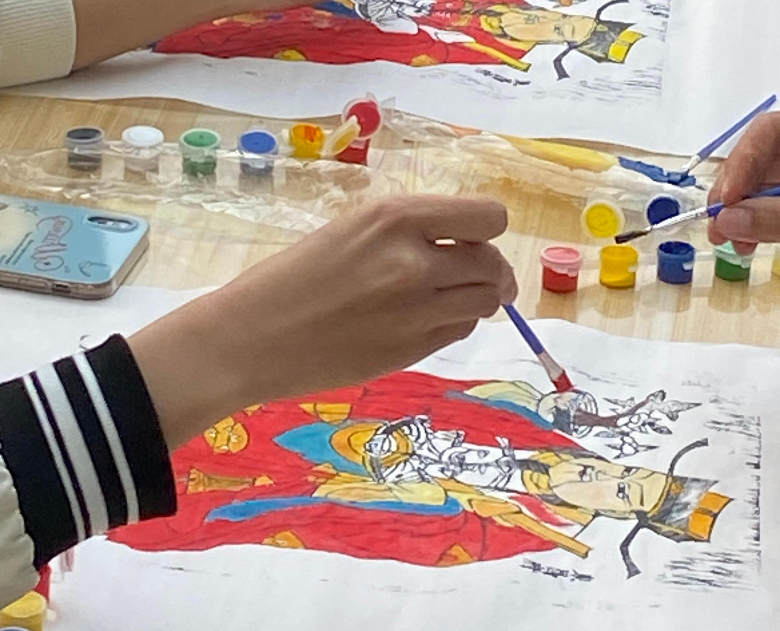 最后,刘老师鼓励大家进行年画创新创意实践,引导参与人员们根据个人喜好选择色彩,对印制好的年画线稿进行个性化的绘制与装饰,从而创作出独具特色的财神形象。这一环节不仅加深了学员们对东昌府木版年画制作技艺的理解与掌握,还激发了他们的创造力与想象力。