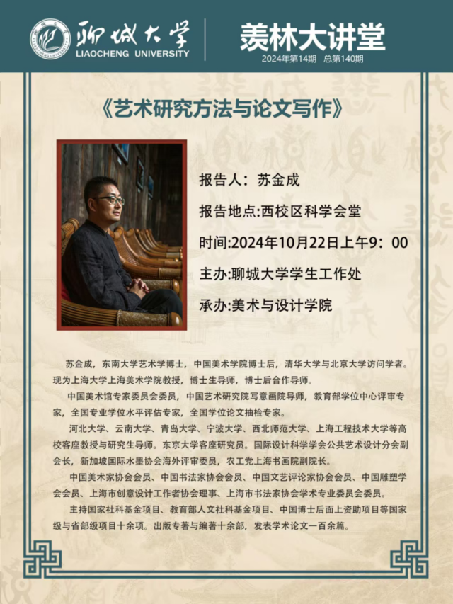 为拓宽学生学术视野,提升学生的创新能力,10月22日,由聊城大学学生工作处主办、美术与设计学院承办的第140期“羡林大讲堂”于西校区科学会堂举行。上海大学苏金成教授受邀作了题为《艺术研究方法与论文写作》的讲座,讲座由美术与设计学院副院长史秀娜主持,美术与设计学院师生600余人参加报告会。