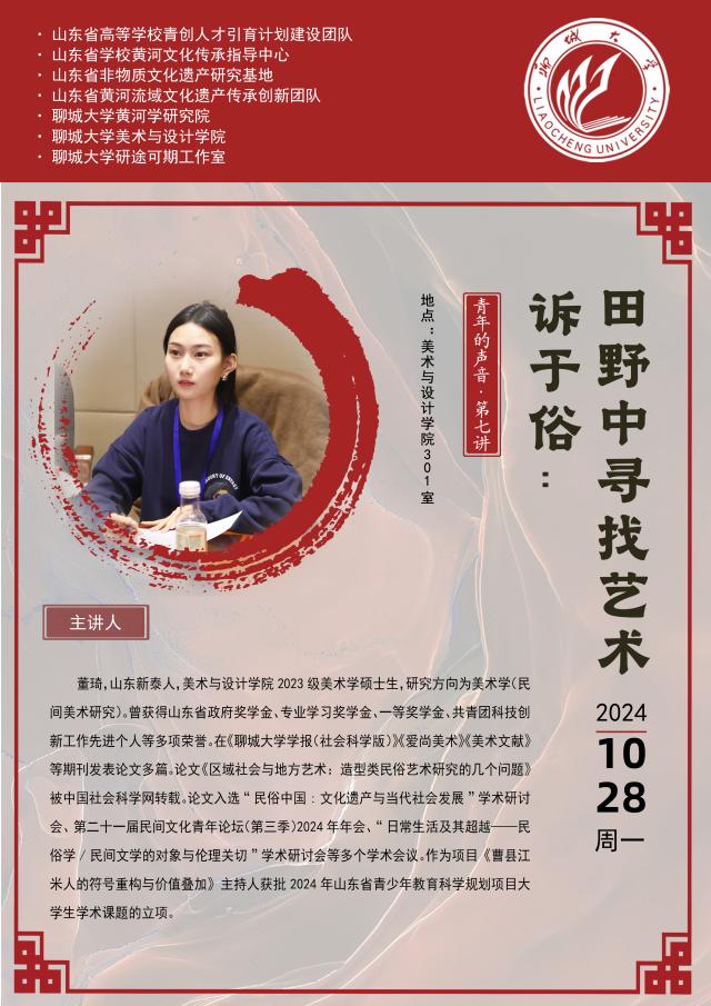 董琦:《诉与俗:田野中寻找艺术》 作者:张云斐 来源:美术与设计学院 发布时间:2024-11-05 阅读次数: 10月28日,2023级研究生董琦为2021级部分本科生作题为《诉与俗:田野中寻找艺术》的学术分享。 董琦分享她从集体的田野考察到自己独立开展的田野考察经历,讲述其在田野考察过程中如何实现理论成果的转化,强调了文献阅读与田野考察之间的互促作用。 最后,董琦以曹县江米人和当地桃源集花供会为案例,让同学们更直观地了解民间美术和民俗之间的关系。 审核 张兆林 史秀娜 孙艺