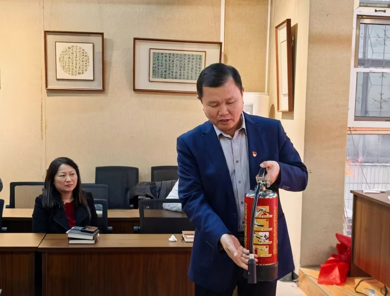 讲座最后,秦正良老师为学院教职工详细讲解了灭火器的使用方法。“一提,提起灭火器;二拔,拔掉保险销;三握,握住喷管最前端;四压,按下压把扫射灭火。”简洁明了的口诀让教职工们迅速记住了关键步骤。随后,在消防人员的指导下,教职工们纷纷亲自上阵,进行灭火器的实际操作。