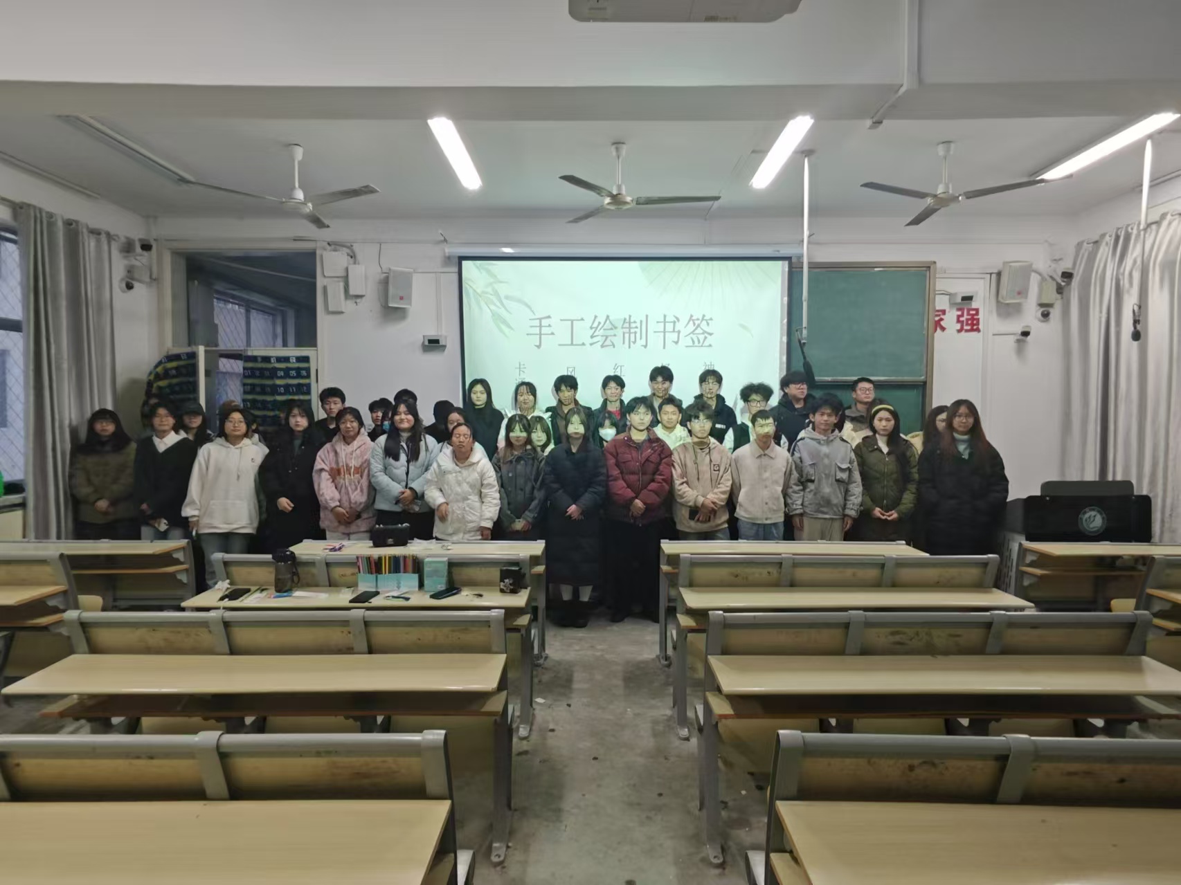 活动前期,负责人满怀热忱,不遗余力地展开宣传。他们穿梭于教室、宿舍间,将活动目的细细拆解、娓娓道来,宛如传递文化火种般,点燃同学们心底的好奇与期待,为活动预热。正式开场,负责人站在讲台,轻点鼠标,课件上的图文徐徐展开,书签从古至今的“前世今生”渐次浮现。从古代文人雅士藏书所用的精致签条,到现代风格多元、材质丰富的创意书签,其演变历程似一部微缩文化史,引得同学们沉浸其中、思绪纷飞,参与热情也随之高涨。讲解完毕,一沓沓空白书签分发至同学们手中,它们宛如待绘的素锦,承载着无限可能。同学们灵感泉涌,有的以传统水墨勾勒梅兰竹菊,让古韵在方寸间流淌,彰显文人风骨;有的用缤纷彩笔描绘航天盛景,寄寓科技强国梦,尽显时代气息。绘制完成,大家踊跃分享,展示独特创意,在相机快门声中,定格下此刻的艺术成果与灿烂笑容。