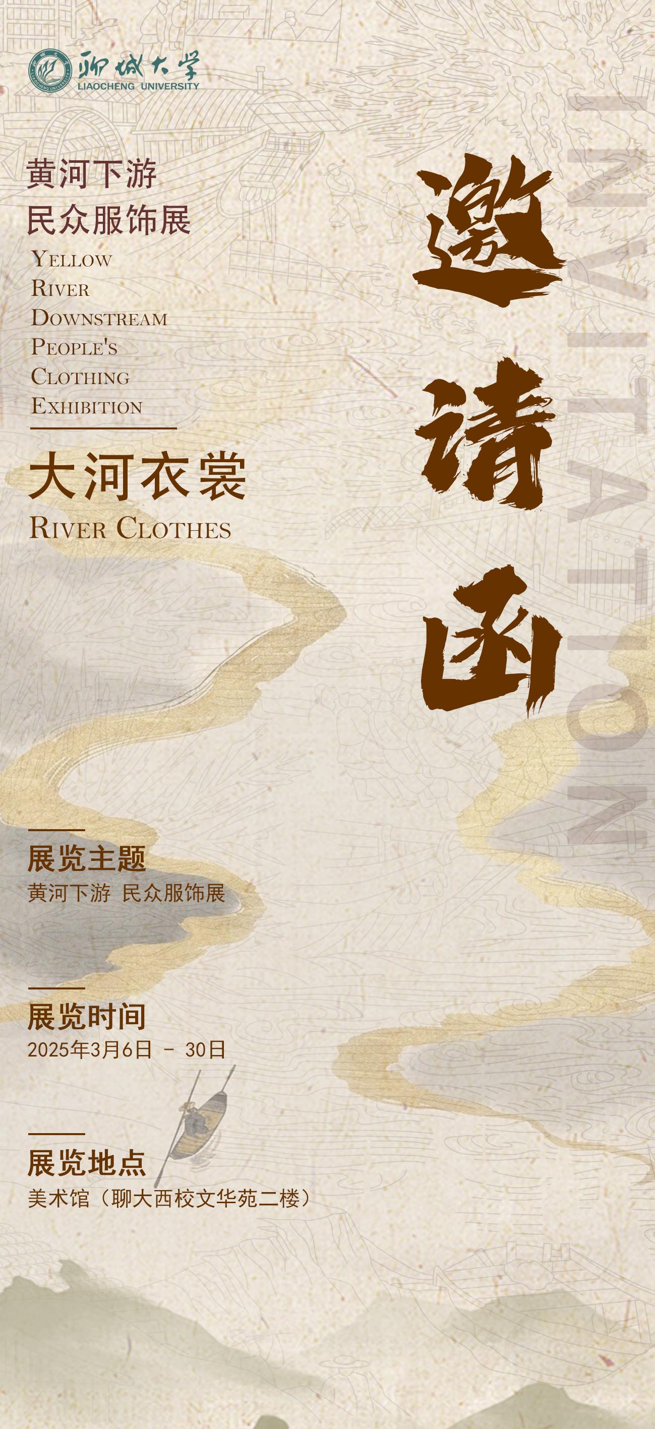 明日,让我们循着衣襟上的纹路,溯源母亲河的脉搏,聆听岁月缝纫的故事。以指尖丈量文明的厚度,用目光打捞沉浮的华彩。当灯光照射在展柜的玻璃,这些沉睡的衣裳将在您的注视中苏醒。3月6日聊城大学美术馆,我们不见不散!