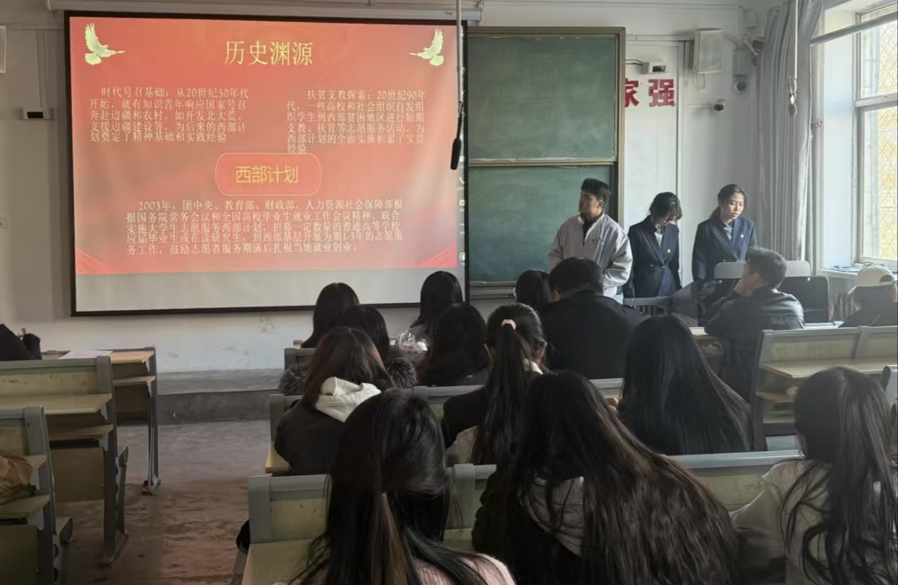 宣讲团成员通过图文结合和播放视频的形式,系统梳理了聊城大学西部计划的发展历程,重点解读学校在专项经费保障、校地协同机制创新等方面的特色举措,帮助同学们深入了解学校西部计划成果。详细解读了参与西部计划的政策支持和资金保障,介绍了志愿者的条件要求,使同学们对西部计划的政策保障及自身适配情况有了全面认识。