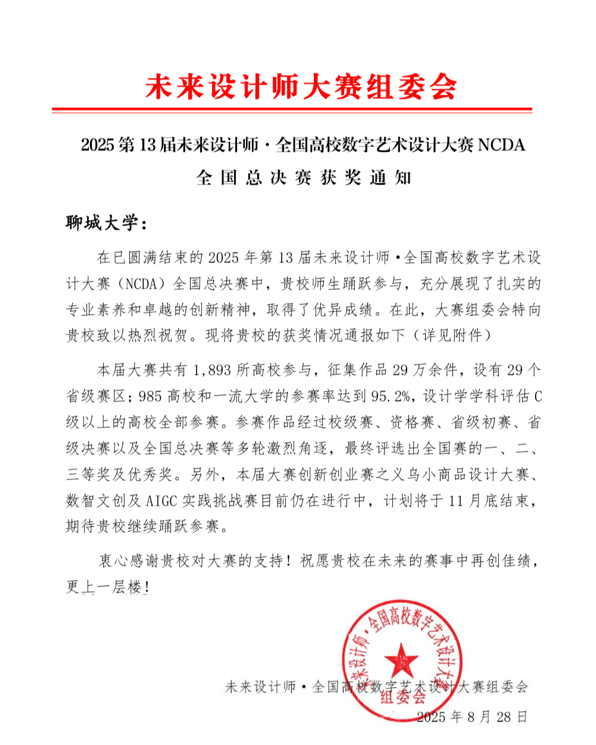 近日,2025第13届未来设计师·全国高校数字艺术设计大赛(NCDA)全国总决赛奖项公布,我院学生表现突出,共荣获国赛奖项6项,包括一等奖1项、二等奖2项、三等奖3项。
