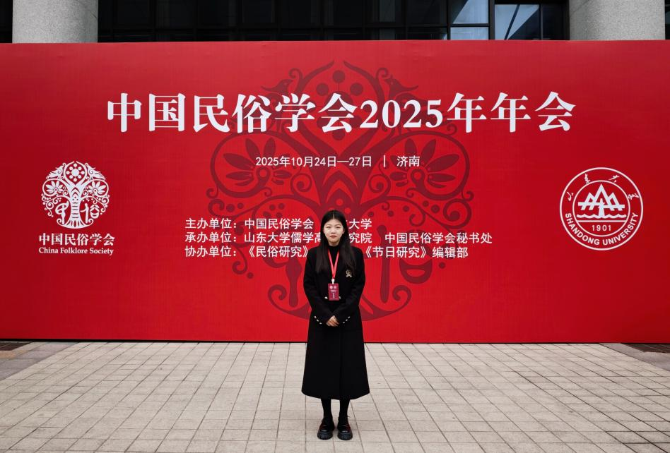 10月24—27日,由中国民俗学会、山东大学联合主办的“中国民俗学会2025年年会”在山东大学中心校区开幕,本次年会的主题是“全球化与本土化对话中的民俗学自主知识体系建设”。本届年会内容广泛,涉及民俗学标识性概念、中国故事学、中国民间文学本土理论、非物质文化遗产保护、泰山文化等多个前沿话题。我院2023级美术学专业研究生邢怀焱论文入选并应邀参会。
