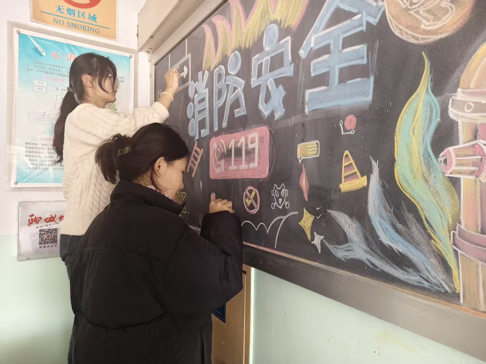 为了夯实校园消防安全根基,增强同学们对消防安全的重视,提升防火避险能力,美术与设计学院女生宿舍服务中心于114日在学苑公寓五号楼大厅开展了黑板报的创作,绘制了“一笔一画绘消防  校园安全有保障”主题黑板报。