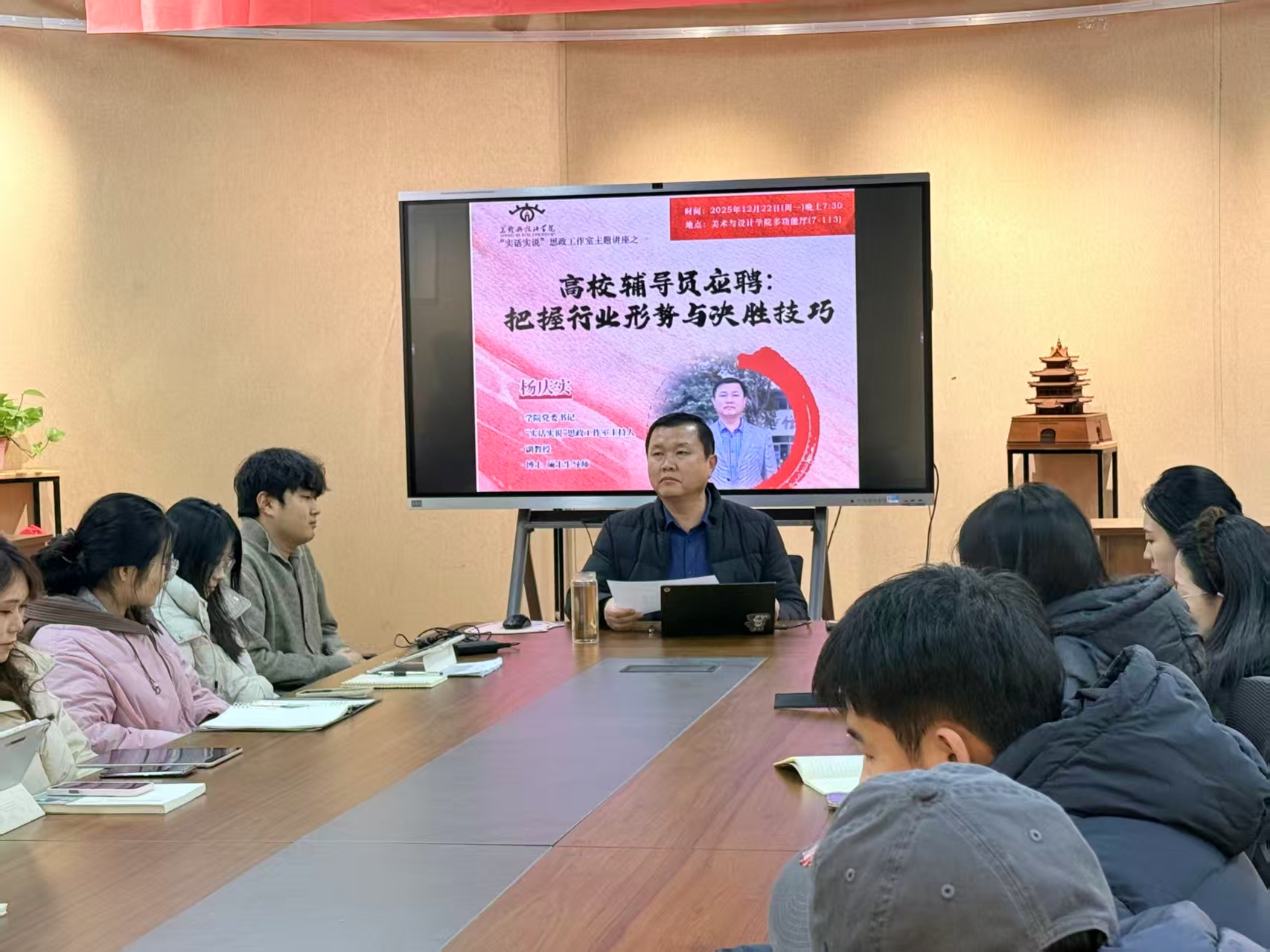 为深入推进学院毕业生高质量就业工程,助力学生明晰职业发展方向、提升应聘竞争力,12月22日,美术与设计学院举办“高校辅导员应聘:把握行业形势与决胜技巧”主题讲座,学院2023级研究生党员、2025级研究生共50余人到场参加,由学院党委书记、“实话实说”思政工作室主持人杨庆实主讲。