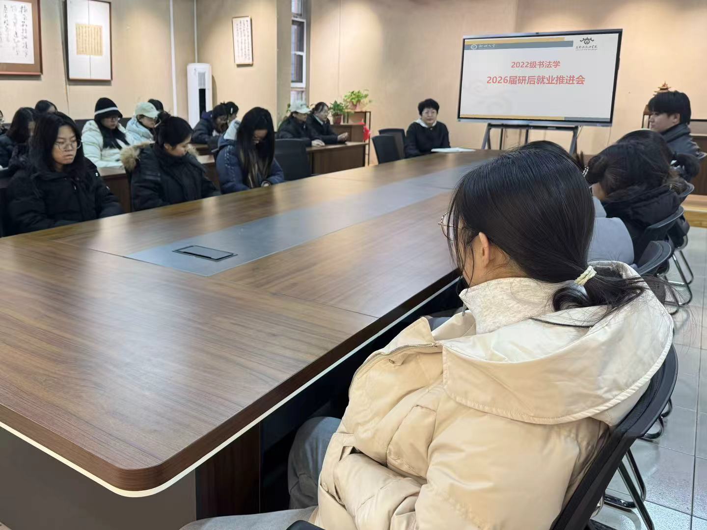 为切实帮助 2026 届毕业生明晰就业态势、抢抓求职关键窗口期,主动应对当前就业领域结构性矛盾与压力,美术与设计学院紧抓考研初试结束的重要节点,于12月23-24日,开展2026届毕业生研后就业推进班会。学院党委副书记、副院长孙研红,团委书记孔德滕及毕业年级辅导员分批次召开班会。