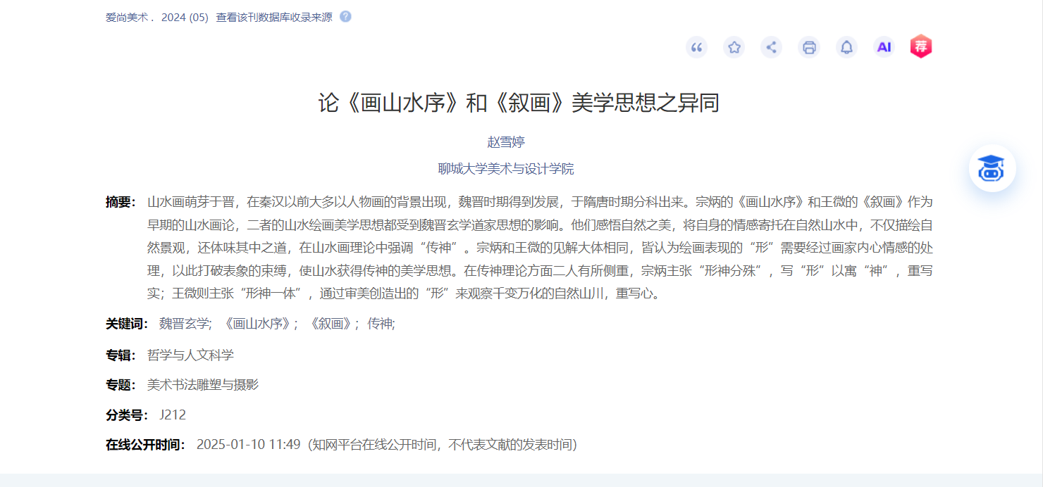 2024年10月论文《论〈画山水序〉和〈叙画〉美学思想之异同》发表于《爱尚美术》。