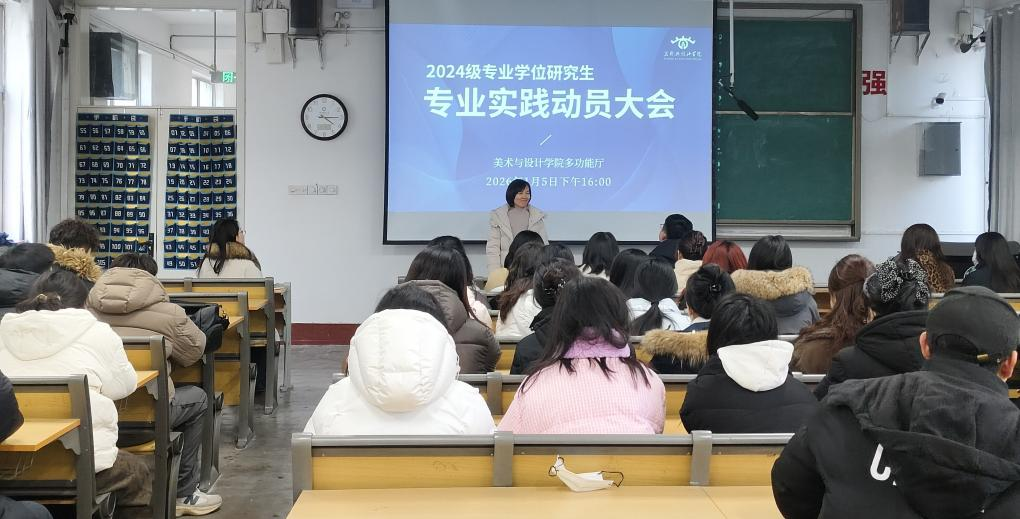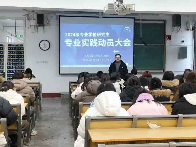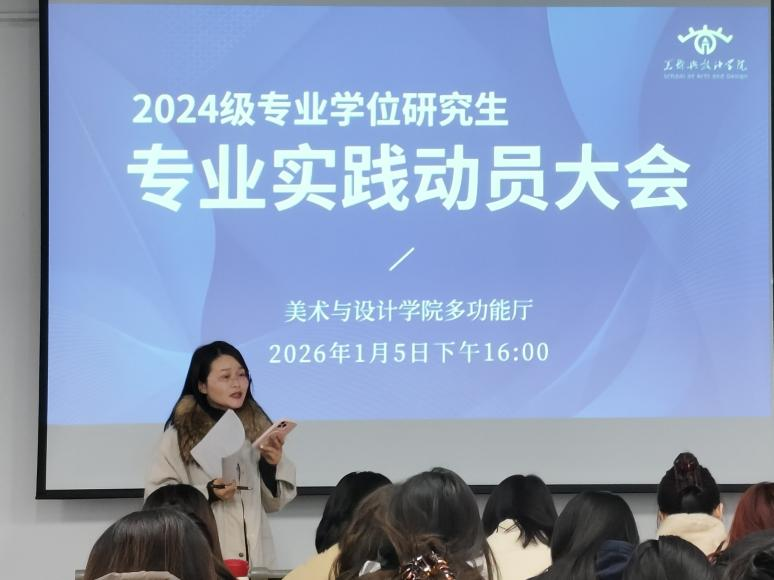 为扎实推进专业学位研究生培养工作,引导学生明确实践目标、做好实习准备,2026年1月5日,美术与设计学院召开2024级专业学位研究生专业实践动员大会。院长史秀娜、科研秘书王蕊、导师代表刘翠翠博士、辅导员班主任崔洁康出席会议,2024级全体研究生参会。