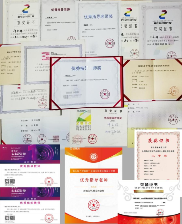 近年来出版专著《城市景观与室内设计》,在《文艺研究》《艺术百家》《山东大学学报(哲学和社会科学版)》《包装工程》等专业期刊发表专业论文和设计作品多篇,主持和参与了教育部产学研合作协同育人项目等多项课题,曾获山东省文化艺术科学优秀成果二等奖、第二、三届高校美术与设计专业师生基本功大赛一、二等奖、聊城市社会科学优秀成果奖,全国高等院校建筑与环境设计专业学生作品大奖赛优秀指导教师奖、第二、三、四、五、六、七、八届“中装杯”全国大学生环境设计大赛优秀指导教师奖、NCDA未来设计师优秀指导教师奖等多个奖项,所指导的研究生和本科生在各类全国性专业大赛中获得优异成绩。