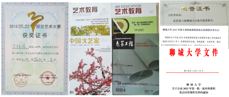 近年来,出版著作两部,在A&HCI和国内重要期刊发表论文十余篇,先后主持聊城市社科2项,聊城大学科研基金2项,聊城大学教学改革项目2项,获批聊城大学一流课程1门,聊城大学课程思政示范课1门。获山东省高校美术与设计专业师生基本功比赛二等奖1项,聊城大学青年教师教学比赛一等奖1项,二等奖1项。并多次指导学生获得相关领域的创业实践大奖、设计奖项、创业立项,多次获得“大学生广告艺术大赛优秀指导教师”、“中国大学生广告艺术节学院奖优秀指导教师”的称号。