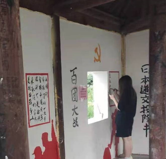 美术与设计学院志愿者共同携手创作以一种别具特色、别开生面的方式向党的百年华诞献礼。志愿者们提前准备好活动所需的颜料,画笔等绘画工具,测量好墙绘尺寸,确定墙绘内容同时和社区工作人员进行协商沟通,了解社区工作的作息时间,组织人员安排好各个志愿者负责的内容,将有关建党百年的绘制内容分发于每个参与者手中,保证活动的质量与速度。画笔地缓缓挥动,让洁白的墙面慢慢变得栩栩如生。美术生将光彩夺目的党旗与抗战英雄的剪影勾勒的唯妙唯俏;书法生则将提前准备好的各个战役书写出来,使墙面形成一张张交卷般的模样。在本次活动过程中,同学们利用自己的专业知识,尽全力去展现党的光辉历程,传递红色精神,赞扬党在百年岁月中始终为人民服务的崇高精神。该部分墙绘的独到设计、巧妙的构思、生动的场景、恢弘的气势、精湛的绘画技艺,得到当地干部群众和外来人员的高度认可和喜爱。志愿者也表示希望通过这样的墙绘创作,让更多的人学习党史、了解党史,知道党的艰难与伟大,从而更加热爱党,热爱国家,为了更加美好的明天努力奋斗。活动结束后,志愿者将现场清理干净,使社区保持原有的整洁。