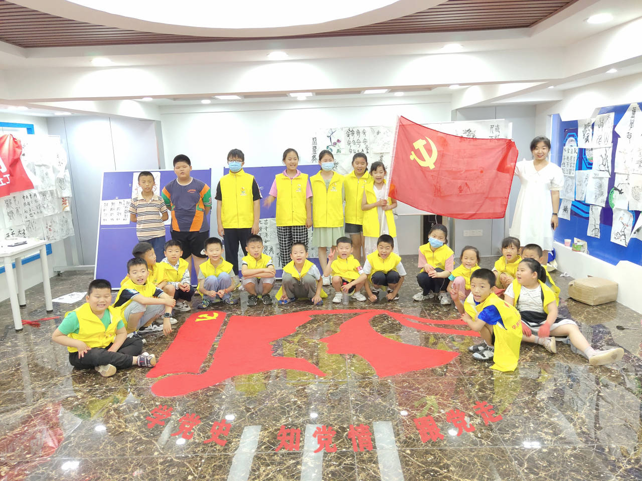 细沙流淌指尖,意境涤荡心灵。志愿者们提前进行了党史故事学习以此做好活动基础,确定好场地及参与人员,并做好活动的宣传工作,并发布有关活动流程和注意事项的内容,确保当天活动能够有条不紊的进行。志愿者们先用粉笔起形,孩子们被精彩的沙画艺术深深地吸引,目不转睛的看着志愿者们画画,起形完成后将提前准备好的红、黄两种颜色的沙子发给小朋友进行填色。随后志愿者通过第一次全国代表大会等革命故事引入中国共产党的成立,继而介绍了中国共产党的发展和壮大。接下来,志愿者教给小朋友们唱党歌、行党礼。一曲《没有共产党就没有新中国》,将现场的气氛推向了高潮,志愿者教授党歌之余给同学们讲述了党姿、党礼,从歌曲的字句发音及声调的抑扬顿挫,孩子们都学习的格外认真,100周年。志愿者向小朋友简易的宣讲建党百年的历程,并通过建党短片让小朋友对党有更深刻认识,以此来庆祝建党。志愿者与小朋友一起动手填色,在此过程中更加深体会到建党百年不易。