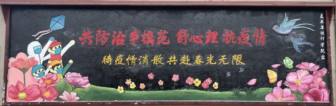 活动初期,志愿者们通过各种渠道搜集防控新冠肺炎疫情的资料,精心设计版面,在最终选定图案后来到活动现场,用彩色颜料书写下“共防治争模范,舒心理抗疫情”“待疫情消散,共赴春光无限”等鼓舞人心的句子,向大家传递出“不畏艰险永向前"的决心和战“疫"必胜的信心。板报中粉色的花朵、青色的草地围绕四周,成群结队的蝴蝶在花丛中翩翩起舞,给板报增添了几分生机;还有那身穿防护服高举手臂的抗疫小战士,生动形象。志愿者们利用黑板报这一宣传阵地,大力宣传疫情防控小知识,既向在抗疫前线的工作人员致敬,又宣传了防疫知识,有利于提高学生的防疫意识,进一步筑牢了维护学生健康安全的屏障。让同学们增强自我保护意识,提高疫情防护能力,人人争做疫情防控的小卫士,为早日打疫情防控阻击战而努力!