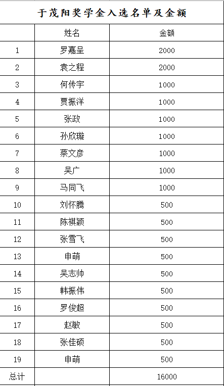 于茂阳奖学金的评选过程严格公正,经过层层筛选和评审,最终有19名学生脱颖而出,获得了该奖学金共16000元。这些学生在学习成绩、艺术等方面都有着优异的表现,他们不仅在学术上取得了突出成就,还积极参与各种社会实践活动,展现了较强的综合素质和社会责任感。