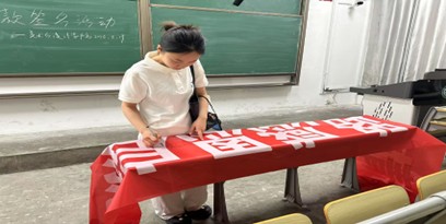 为加强毕业生诚信感恩意识,上好感恩教育最后一堂课,2025年5月19日,美术与设计学院在教学楼教室举办“诚信前行”毕业季条幅签名活动,2025届全体家庭经济困难毕业生参与,以笔墨许下青春诚信承诺。