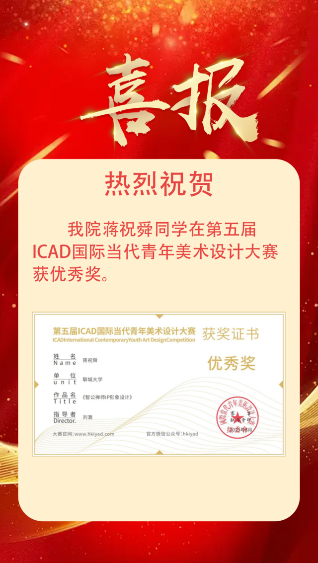 喜报|恭喜我院学子获得第17届全国大学生广告艺术大赛山东赛区优秀奖 作者:么翠红 来源:美术与设计学院 发布时间:2025-11-25 阅读次数: 恭喜蒋祝舜2025.08 第17届全国大学生广告艺术大赛山东赛区优秀奖 (审核 孔德滕)