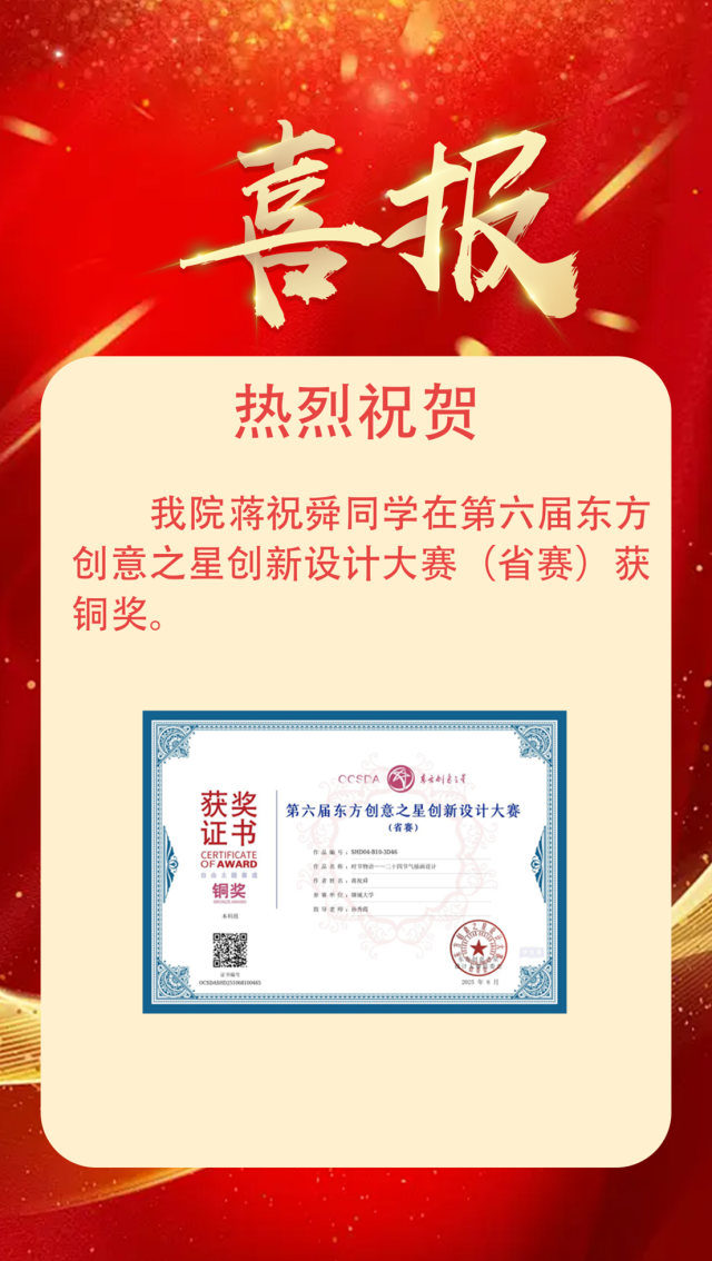 喜报|恭喜我院学子获得第六届东方创意之星创新设计大赛(省赛)铜奖 作者:么翠红 来源:美术与设计学院 发布时间:2025-11-25 阅读次数: 恭喜蒋祝舜2025.08 第六届东方创意之星创新设计大赛(省赛)铜奖 (审核 孔德滕)