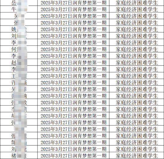 我院24名家庭经济困难学生参加润育梦想第一期培训活动 作者:唐润鹏 来源:美术与设计学院 发布时间:2025-03-27 阅读次数: 2025年3月27日我院24名家庭经济困难学生参加润育梦想第一期培训活动,名单如下: (审核 孔德滕)