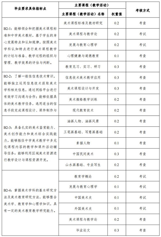 B2-3:具备扎实的美术鉴赏能力、美术创作能力和美术综合实践能力,能够胜任中学美术教学中多元化课程内容的教学和课外活动辅导任务;能够利用区域美术资源进行教学设计与课程资源开发;