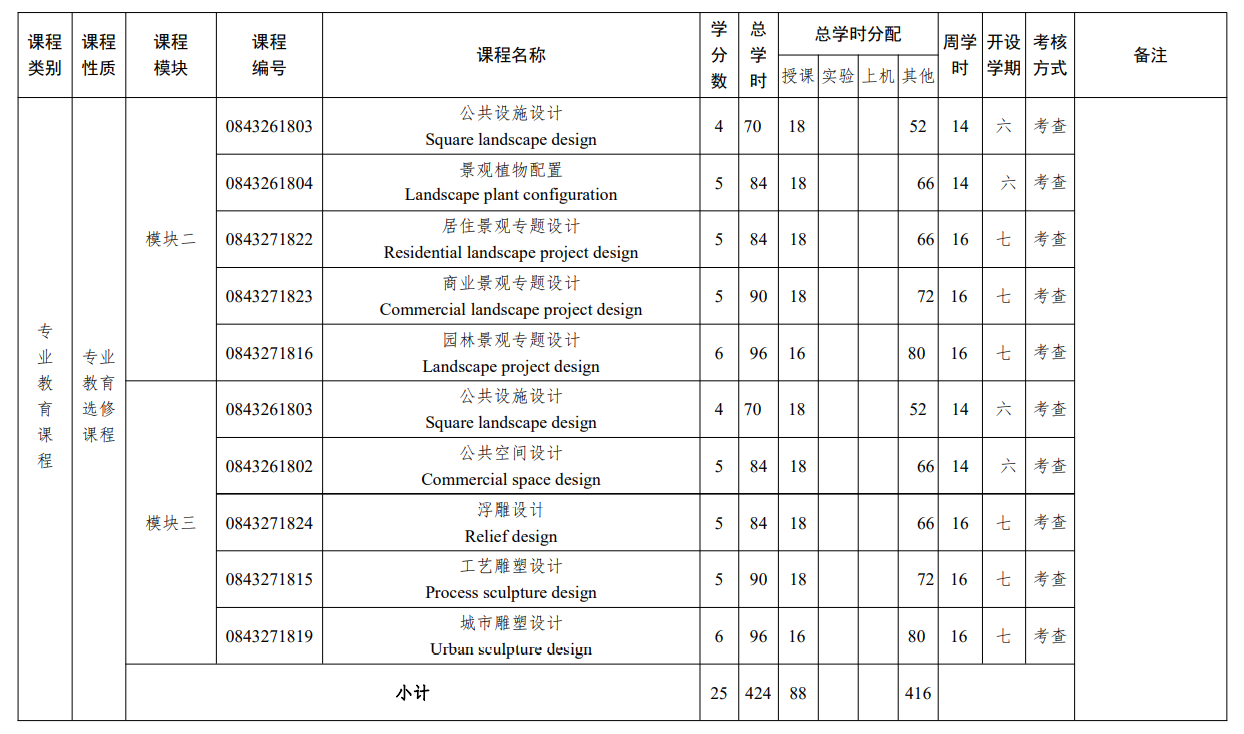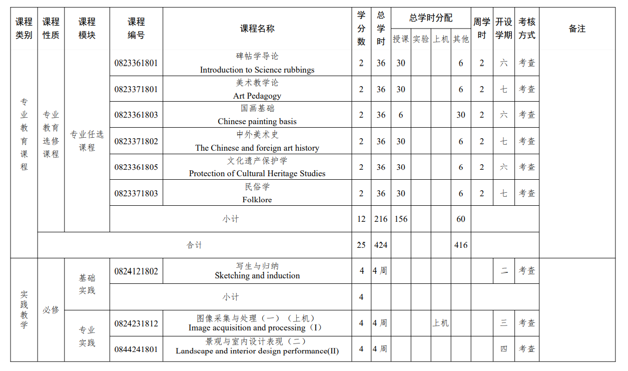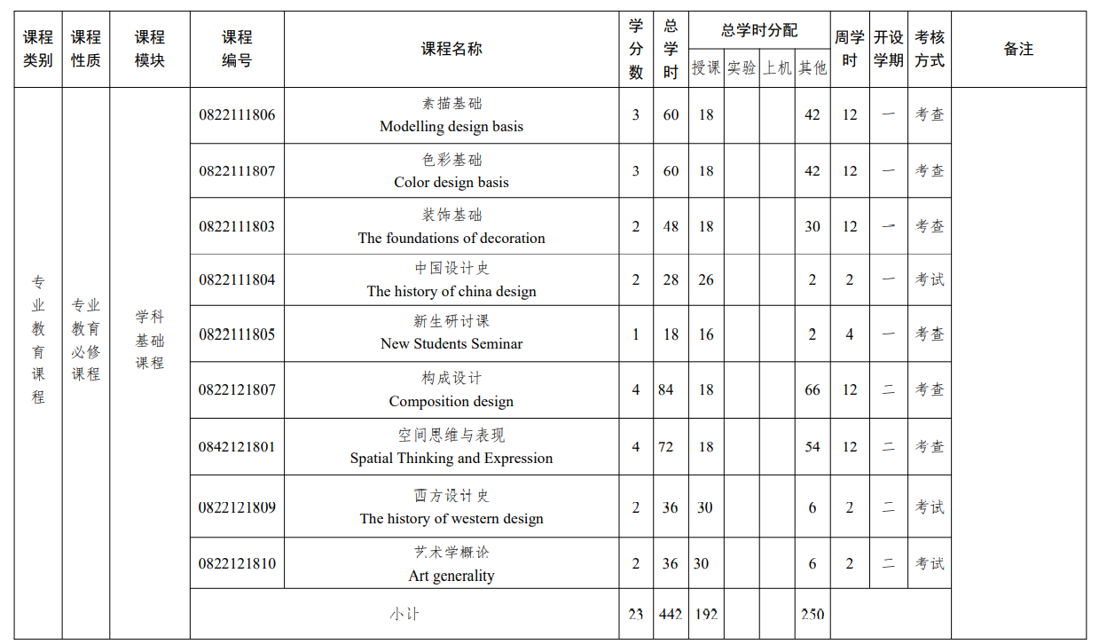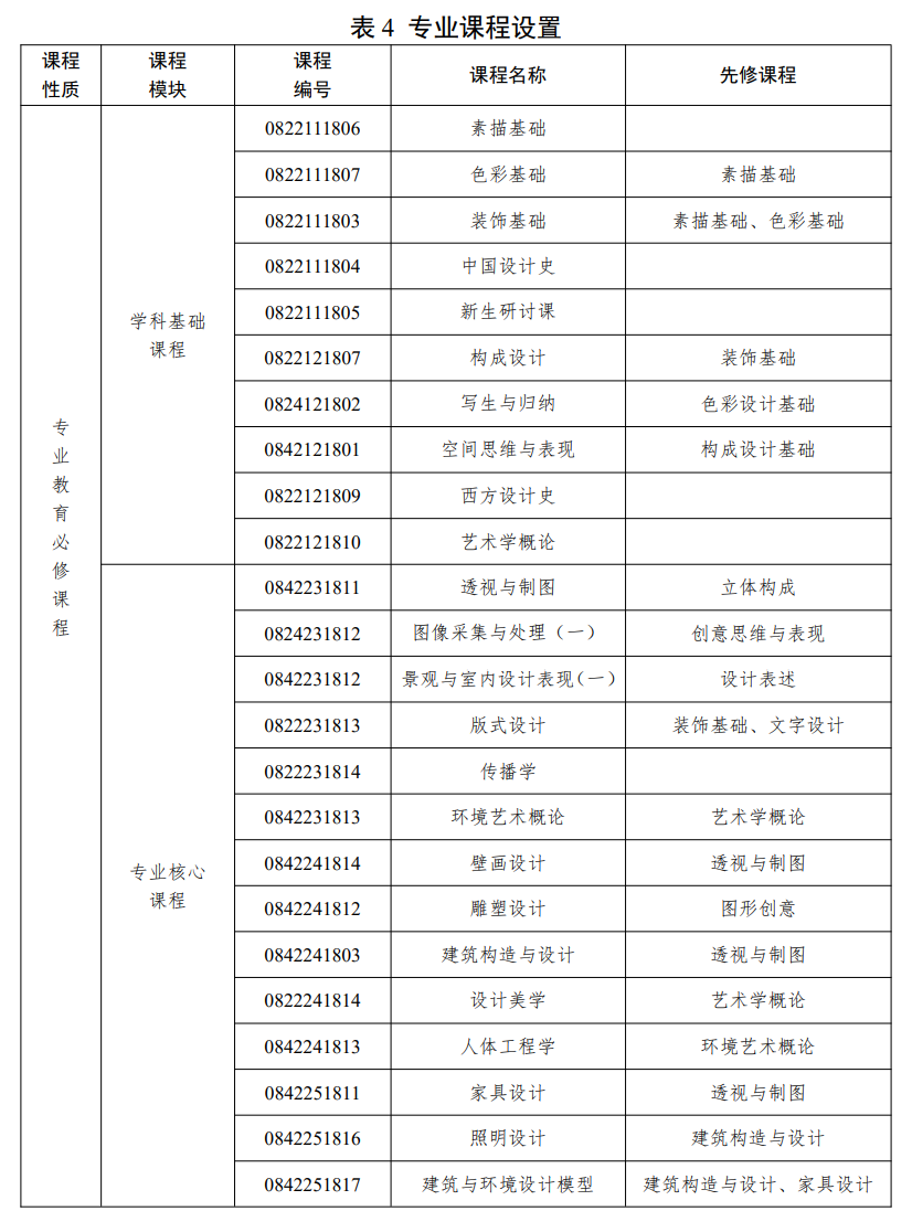 主要课程:素描基础、色彩基础、装饰基础、构成设计基础、空间思维与表达、图像采集与处理(一)、透视制图、壁画设计、景观与室内设计表现、家具设计、雕塑设计、建筑构造与设计、 公共设施设计、建筑与环境设计模型、居住空间设计、景观植物配置、公共空间设计、展示空间设 计、园林景观设计、中国设计史、西方设计史、艺术学概论、环境艺术概论、人体工程学、设计美学、室内设计原理、景观设计原理等。