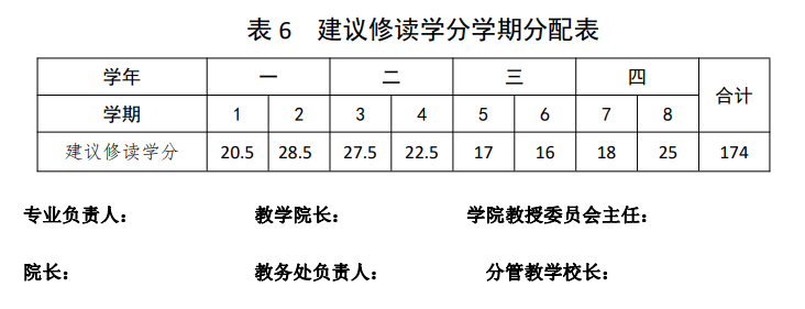 6. 表 6 为本专业本科生建议修读学分学期分配表