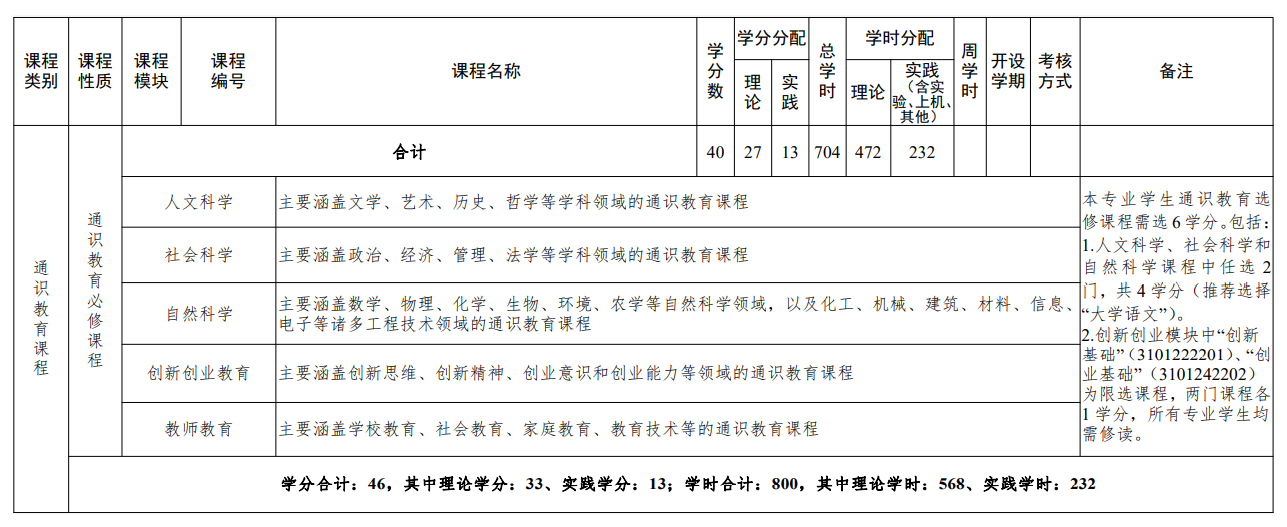 1.本专业本科生必须修满通识教育必修课程 40 学分和通识教育选修课程 6 学分(其中需从人 文科学、社会科学、自然科学、创新创业教育四个通识教育选修课模块中,任选修 4 学分,“创新基础”和“创业基础”各1学分必选),总计 46 学分。