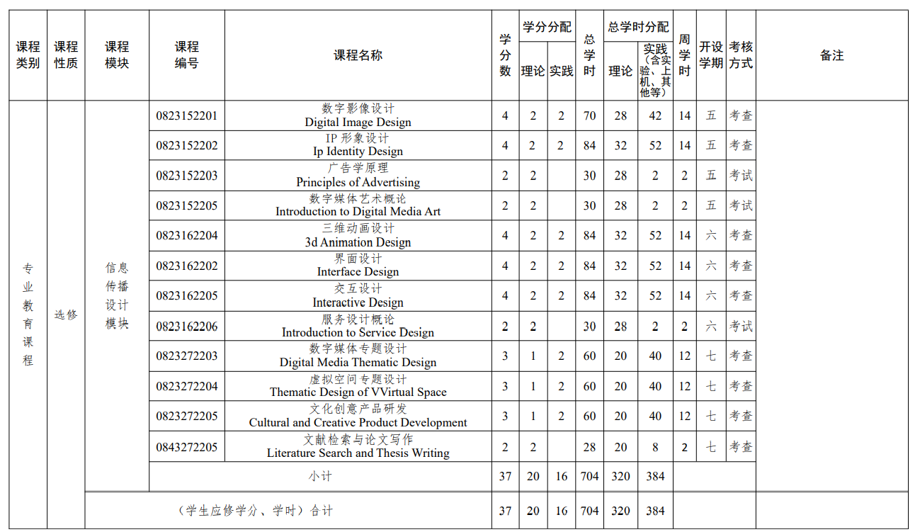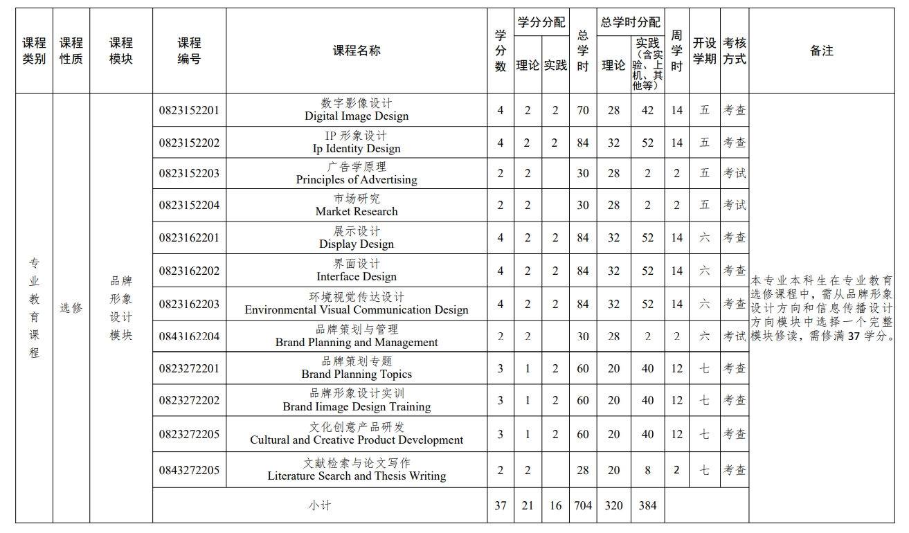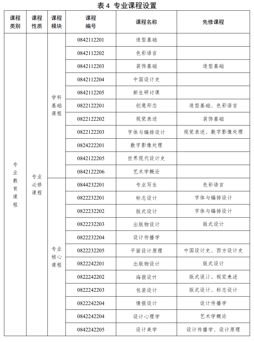主要课程:造型基础、色彩语言、创意形态、视觉表述、数字影像处理、标志设计、海报设计、 包装设计、信息可视化设计、数字影像设计、界面设计、IP 形象设计、品牌策划与管理、品牌形象 设计实训、交互设计、数字媒体设计专题、中国设计史、世界现代设计史、艺术学概论、设计传播 学、广告学原理、设计美学、数字媒体艺术概论、服务设计概论等。