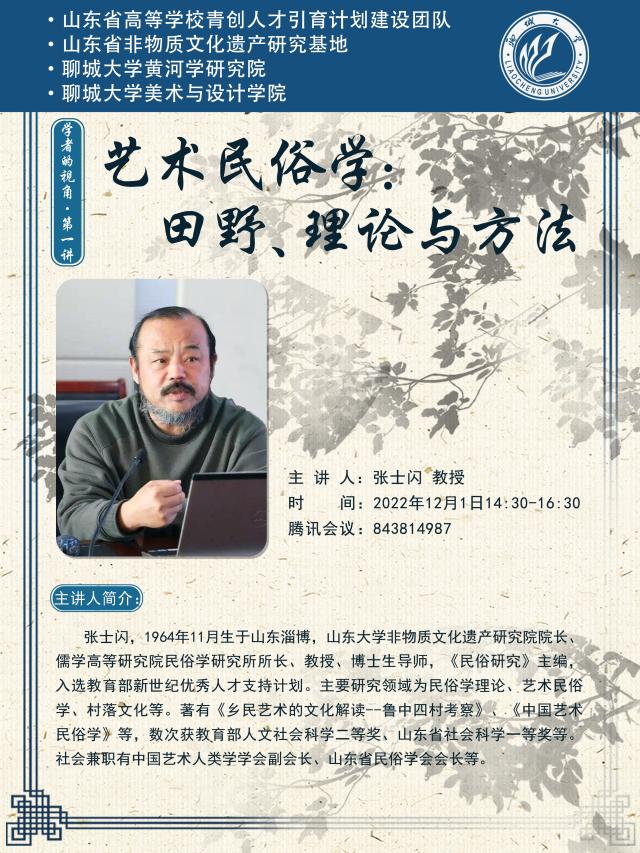 12月1日,山东大学儒学高等研究院教授、博士生导师张士闪应邀做客线上聊大讲坛,通过视频会议的方式作了题为《艺术民俗学:田野、理论与方法》的报告,报告会由美术与设计学院院长张兆林主持。本次讲座采用“线上+线下”结合的方式,线下课堂参与的同时,腾讯会议同步进行线上分享,美术与设计学院、黄河学研究院、运河学研究院等单位的部分师生参加。
