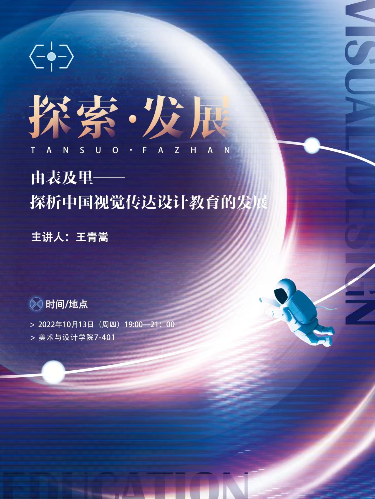 2022年10月13日在7号楼401教室,我院王青嵩老师为2021级全体研究生作题为《由表及里:探析中国近现代视觉传达设计教育的发展》讲座。