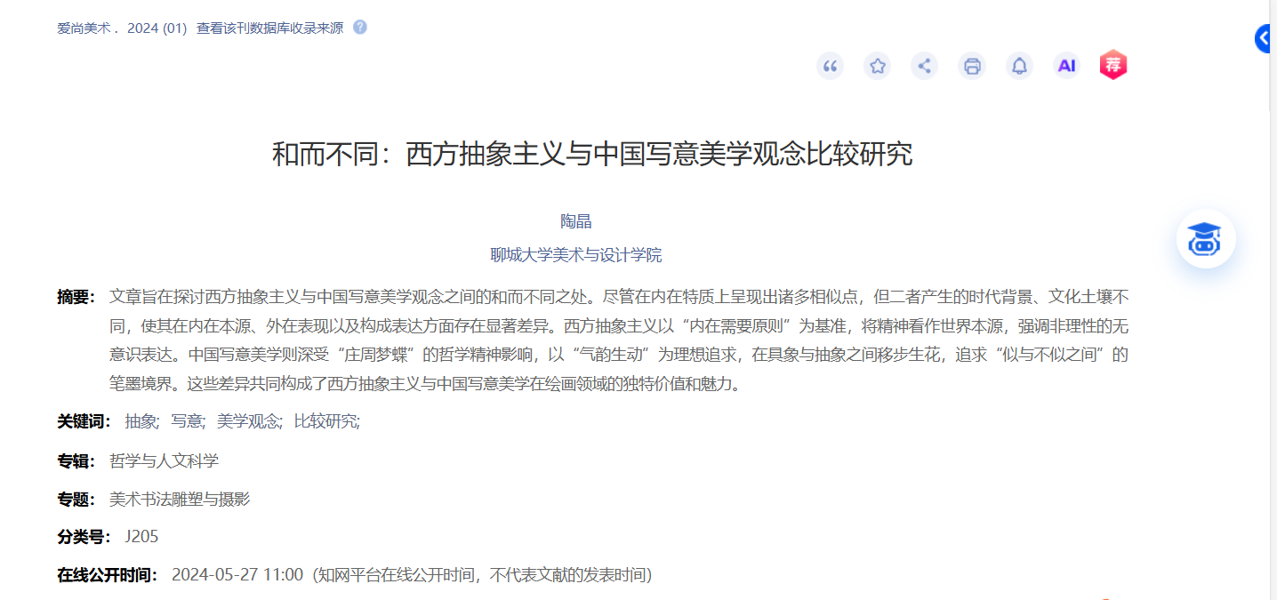2023年11月论文《和而不同:西方抽象主义与中国写意美学观念比较研究》发表于《爱尚美术》。